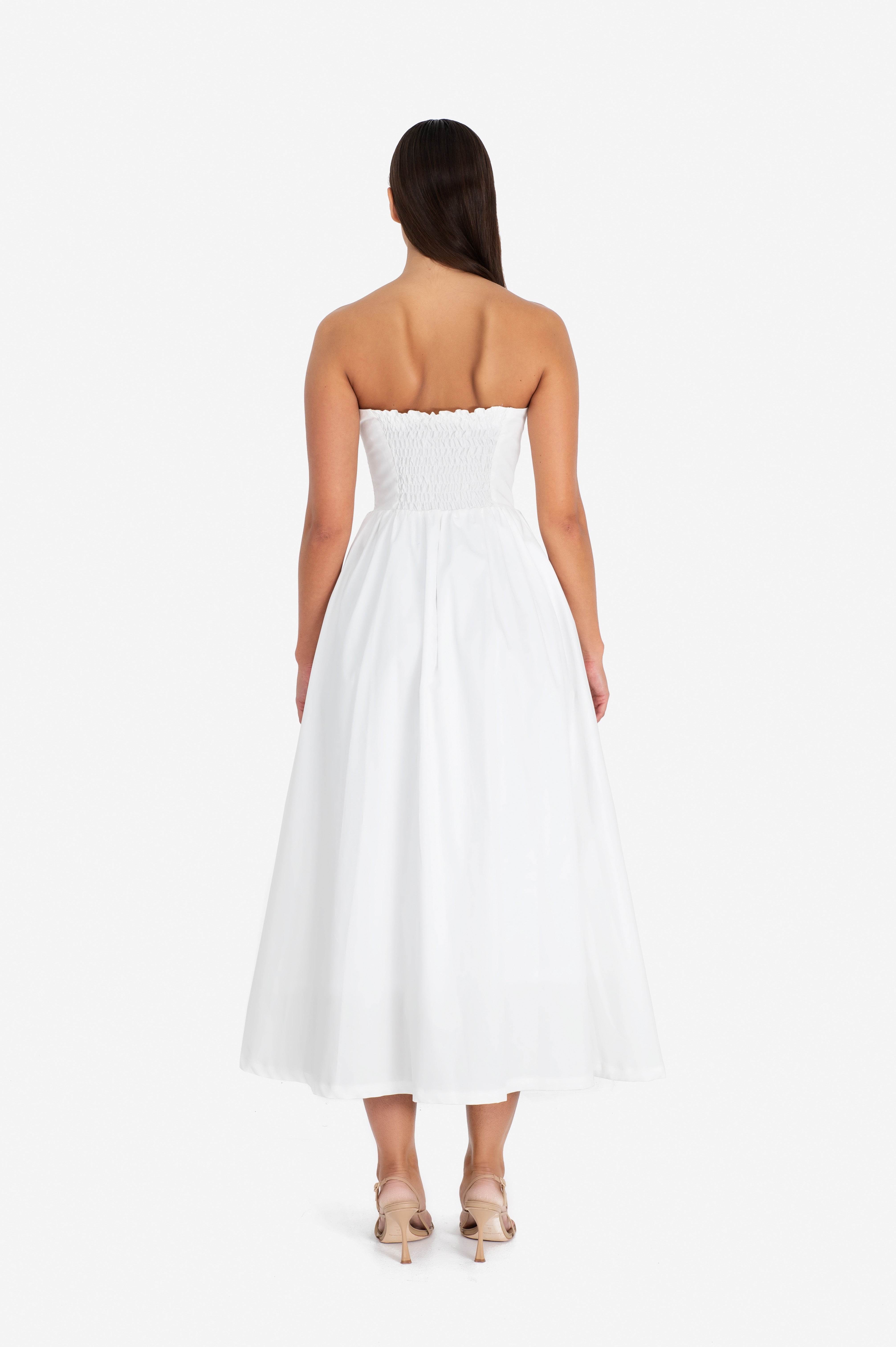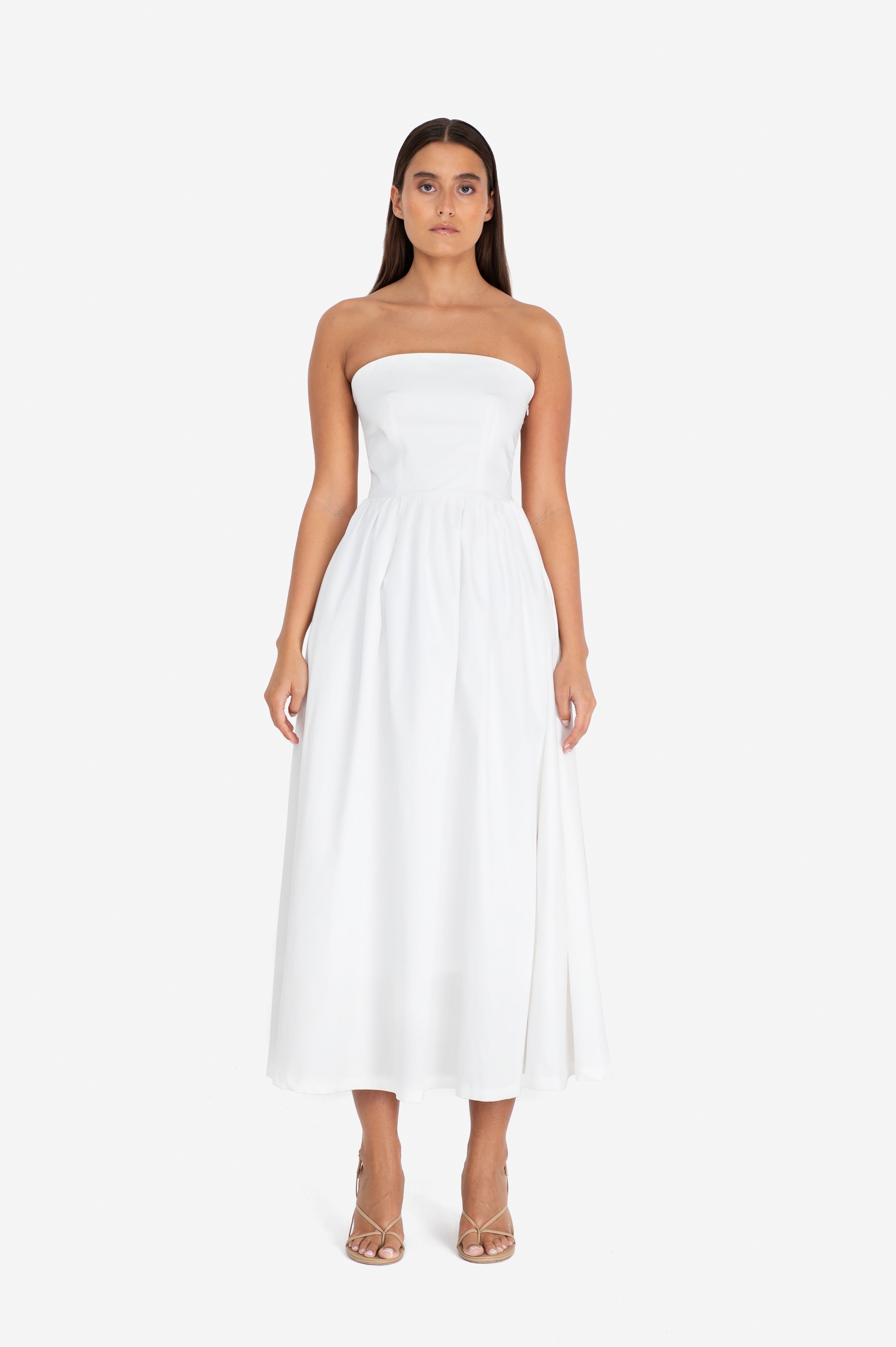 The Rose Dress is the perfect blend of elegance and ease. This strapless midi dress features a sleek bodice and a flowing silhouette, crafted for effortless movement. It comes with detachable straps, allowing you to switch up your look with ease. Whether for a summer soirée or a sunset escape, the Rose Dress is your go-to for timeless sophistication.