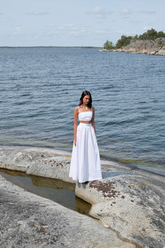 The Rosina Skirt is designed with ease and elegance in mind. Sitting high at the waist, it falls into a full, maxi-length silhouette that moves beautifully as you walk. Made from crisp cotton, it features gathered detailing at the waistband and a hidden zipper at the back for a clean finish. Pair it with the Rosina Top for a matching moment, or dress it down with a tucked-in tee and sandals.