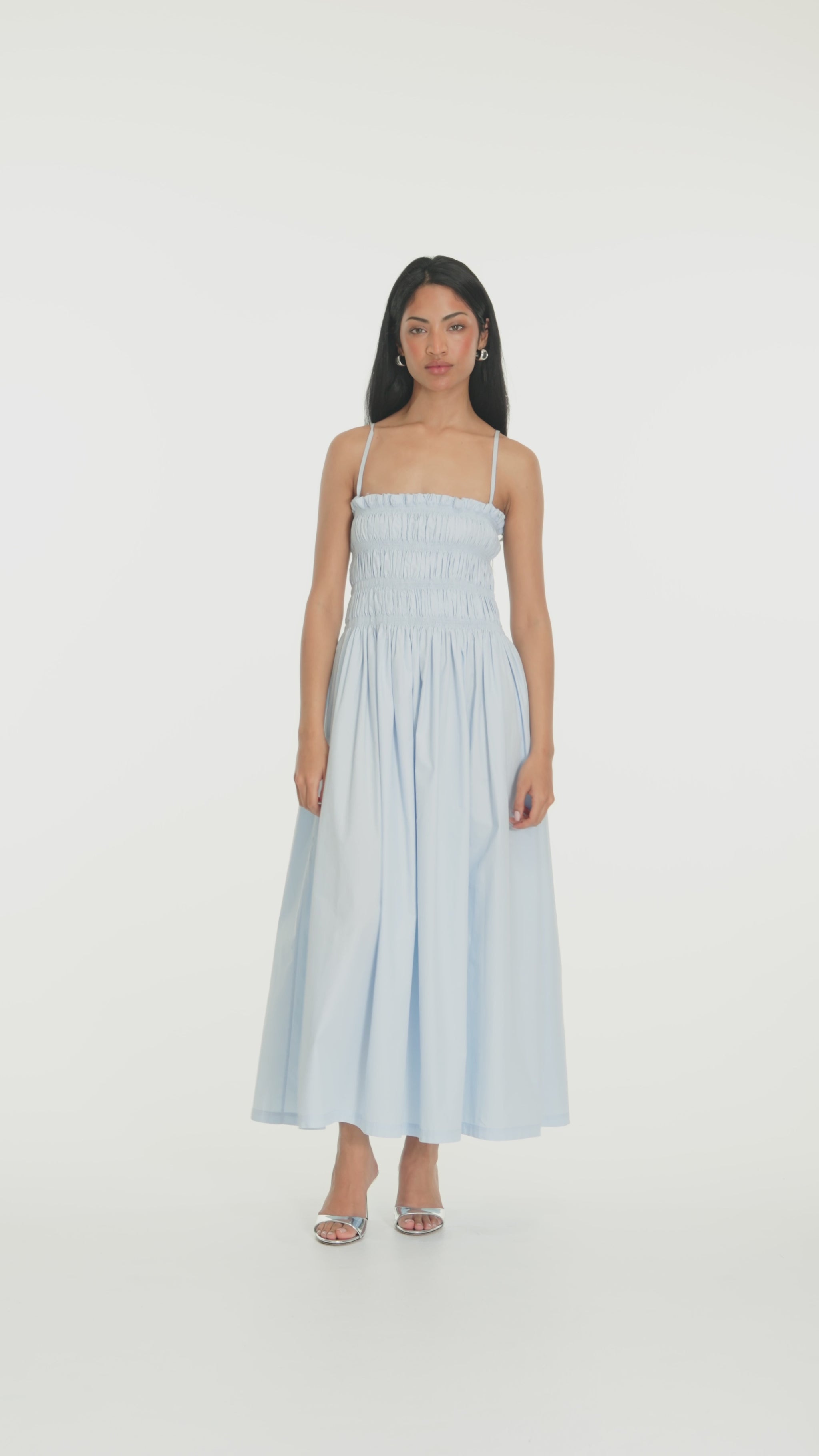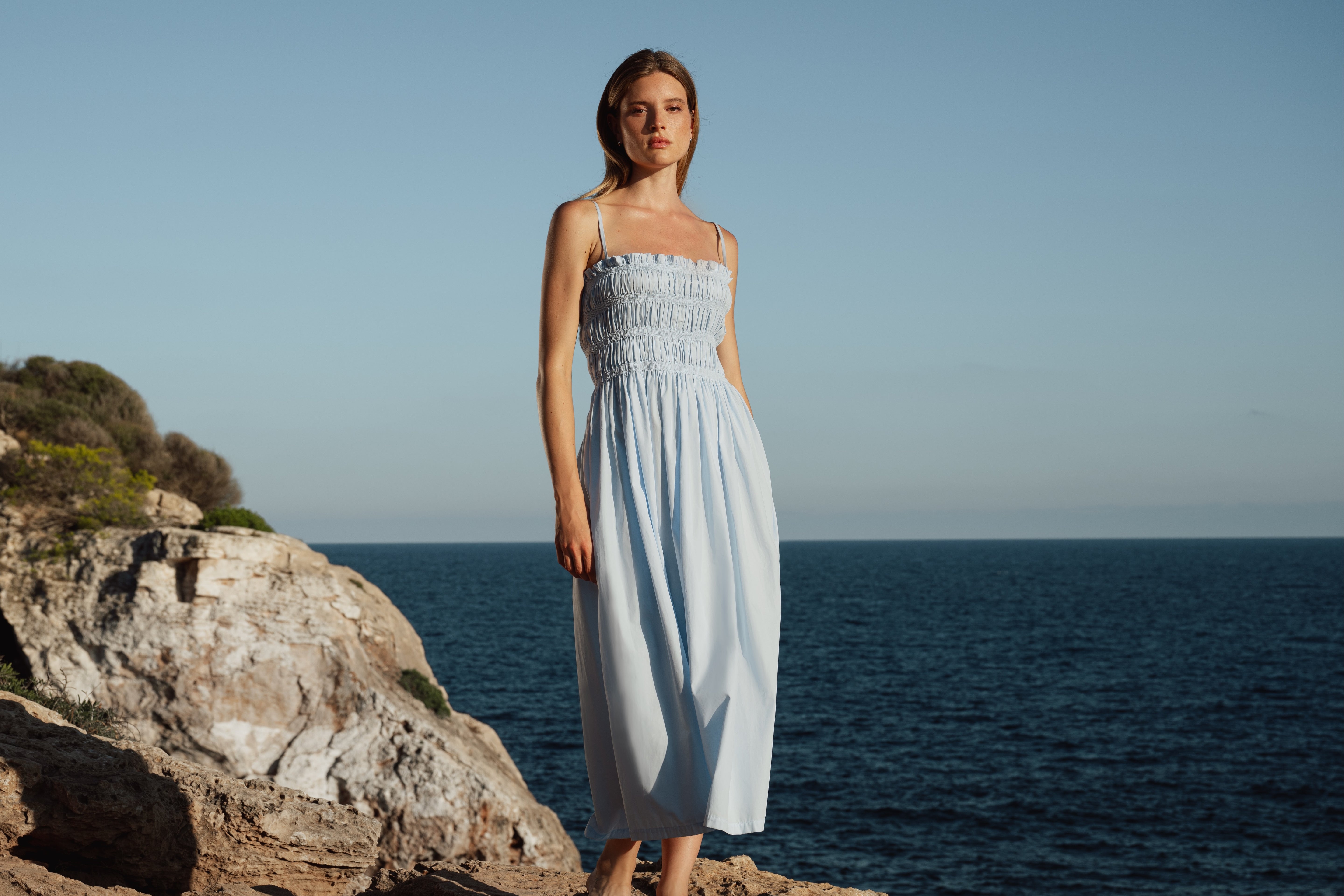The Iris Dress embodies effortless grace and understated charm. Crafted from 100% cotton, it features a smocked bodice with delicate straps and a flowing, midi-length skirt that moves softly with the breeze. The lightweight texture evoke sunlit days and relaxed summer evenings. Simple, timeless, and endlessly wearable.
